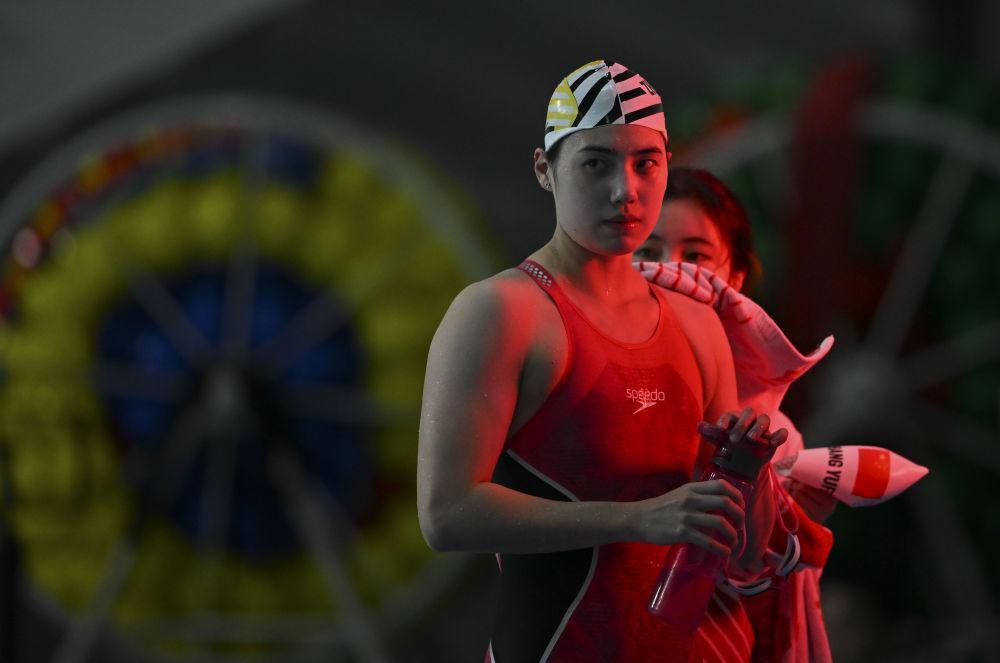 2022年10月29日,張雨霏在2022年短池世錦賽達標賽女子100米蝶泳決賽後查看成績。最終,她以55秒46的成績獲得決賽第一名。新華社記者 陶希夷 攝