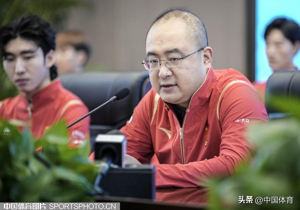 圖爲中國短道速滑隊領隊劉辰宇在見面會上介紹情況