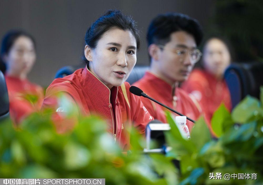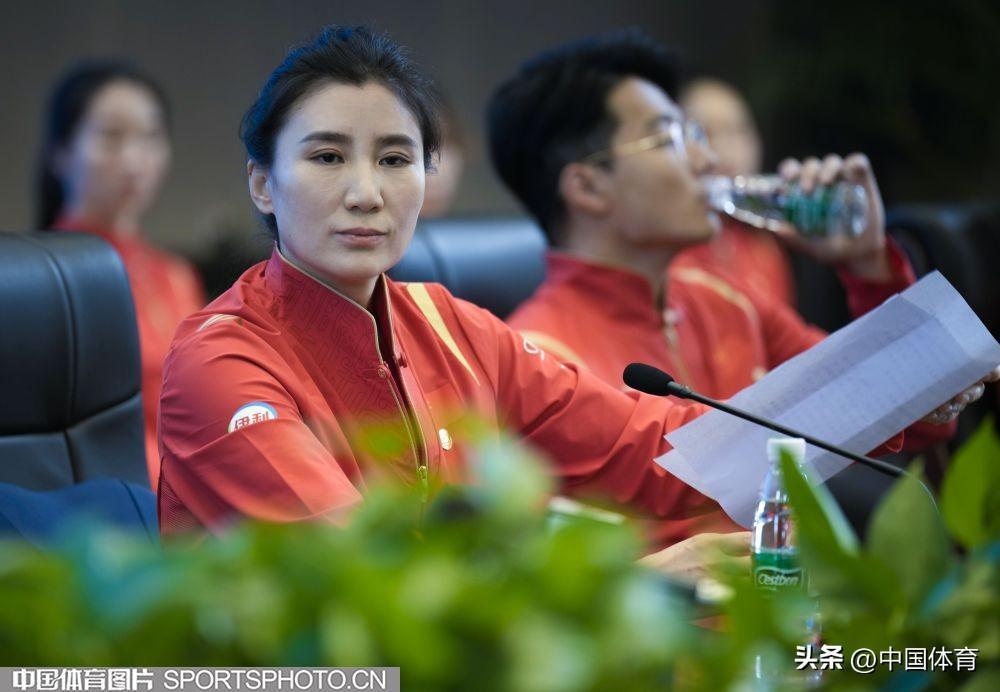圖爲中國短道速滑隊主教練張晶在見面會上介紹情況