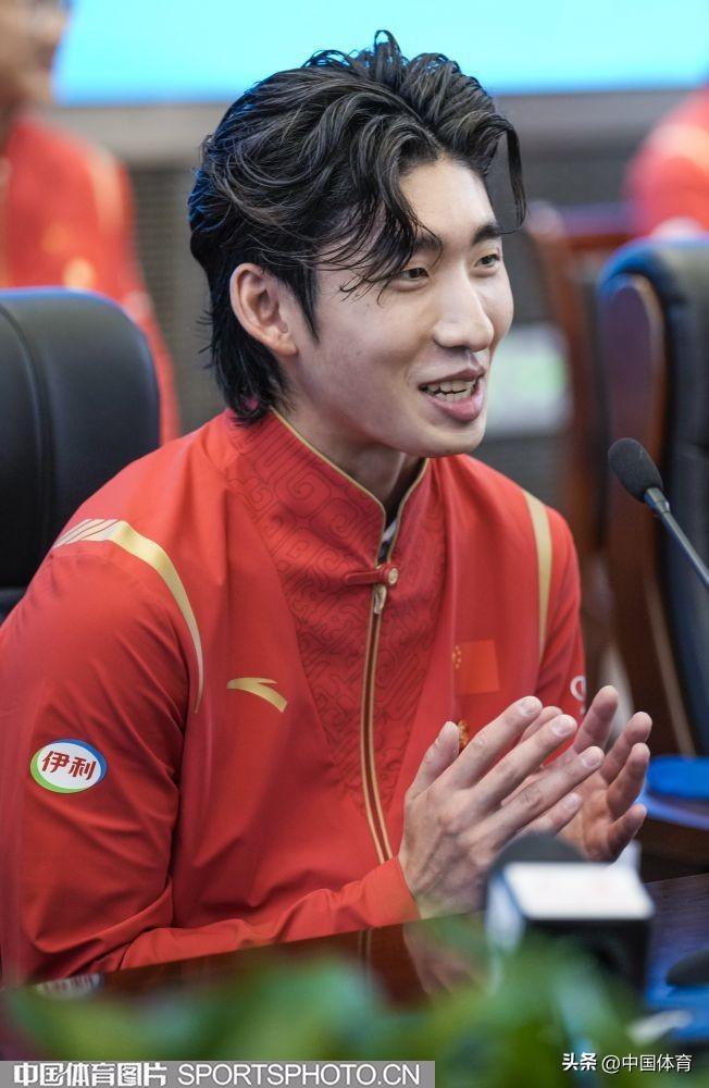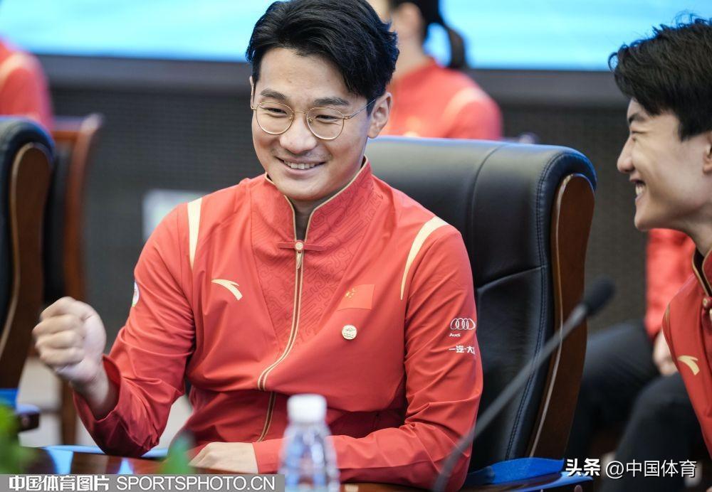 圖爲奧運冠軍任子威在見面會上與隊友交談
