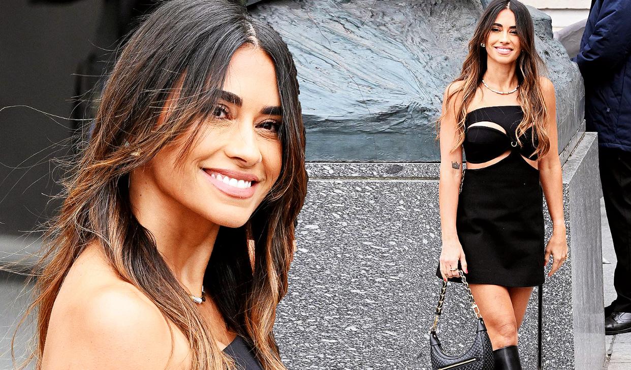 黑色連衣短裙做出特別設計,胸口鏤空切口剪裁,突出她苗條的曲線,腰線若隱若現,非常誘人,身材辣的沒得說。兩塊花瓣在身上服帖,也暗示着安東內拉就是一朵綻放的鮮花,而且她的髮型也很美,舉手投足之間盡顯優雅,與C羅的未婚妻完全是不同的風格,但美豔不輸喬治娜。