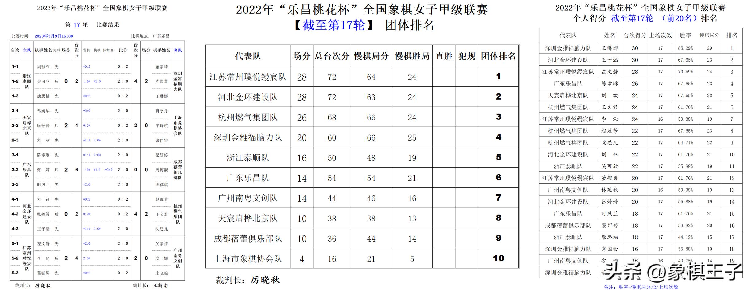 江蘇與河北28分,杭州26分,臺次分蘇冀均72、杭州68,慢棋局分江蘇64、河北63、杭州66,慢棋勝局皆24。