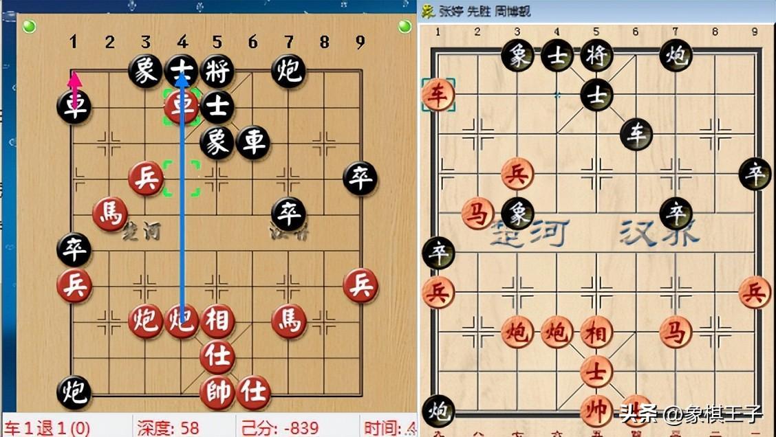 無獨有偶,兩隊另一盤張婷對周博靚的比賽中,張婷進車點象眼,黑本車1退1,退車大優,雙車雙炮殺車雙馬雙炮。