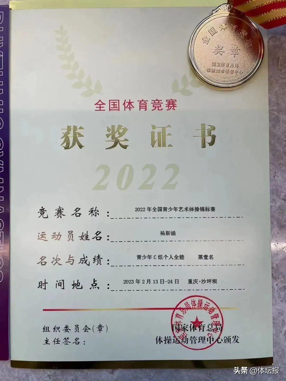 在2022全國青少年藝術體操錦標賽上,代表杭州去野藝術體操俱樂部參賽的她脫穎而出,一舉奪得青少年C組個人全能冠軍。算上這枚含金量十足的金牌,學習藝術體操8年的楊斯涵已斬獲金牌數超40枚,彼時距離她滿13週歲還差6天。