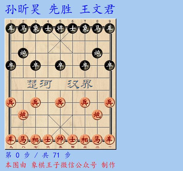 王文君後手求戰,馬5進3跳出,中馬失離要地,紅方抓住機會撲馬邊陲,臥槽馬攻擊,揮炮打車加入,孫昕昊連環猛攻,取車致勝。