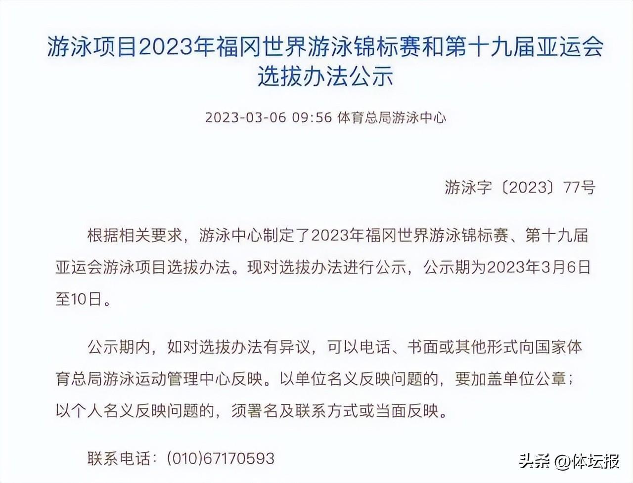 前不久,中國游泳協會網站公佈了2023年福岡世界游泳錦標賽、第十九屆亞運會游泳項目選拔辦法:2023年全國春季游泳錦標賽、全國游泳冠軍賽爲選拔賽,賽程與第十九屆亞運會一致,兩次比賽中各單項最好成績爲主要選拔成績。因此對於想要拿到亞運會入場券的隊員來說本次比賽不容懈怠。