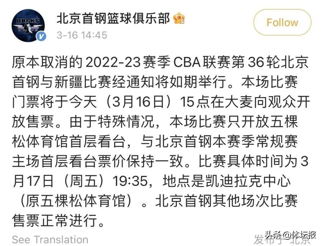 今天下午北京首鋼男籃宣佈,原本取消的CBA常規賽第36輪主場與新疆隊的比賽將如期舉行。這也從側面證明,之前退出的新疆男籃即將回歸CBA。