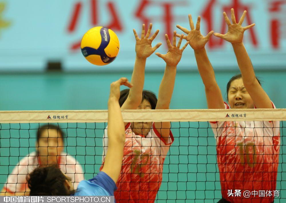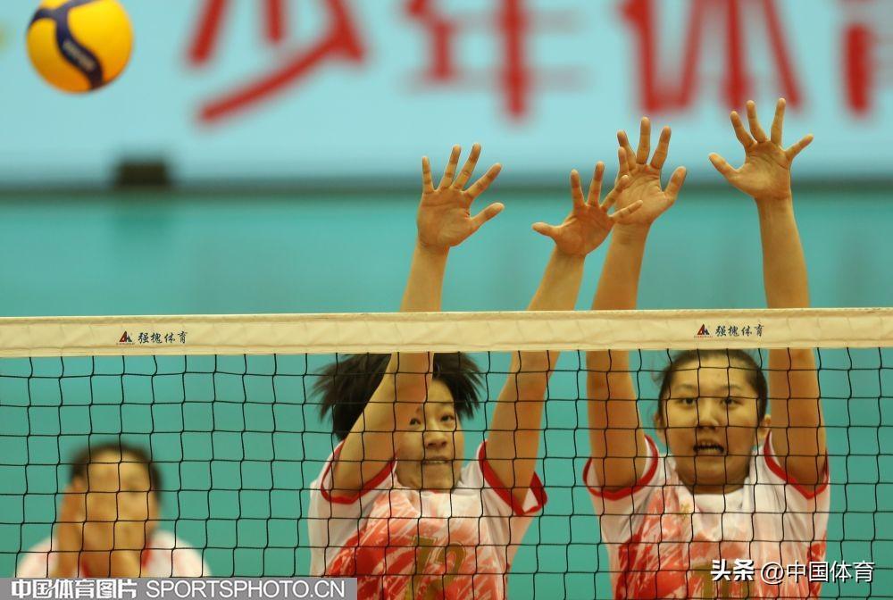 山東濰坊第七中學隊嶽星貝(左)、李美君雙人攔網