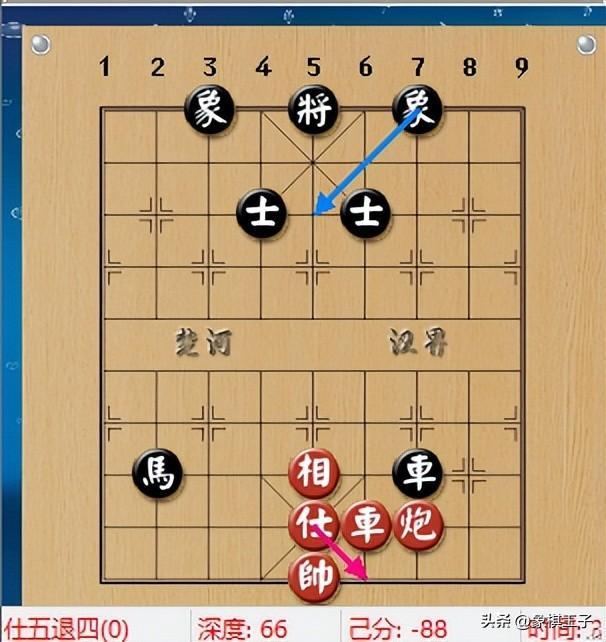 紅是時如落仕,仕五退四,黑車若殺中相將,紅墊中車,可兌死車,黑不敢喫相,回馬定位,紅則平車追馬,黑仍不可殺相將,紅擺中炮,反將,換炮,黑馬逃,紅依中炮將,再讓開相路,紅勢可守。