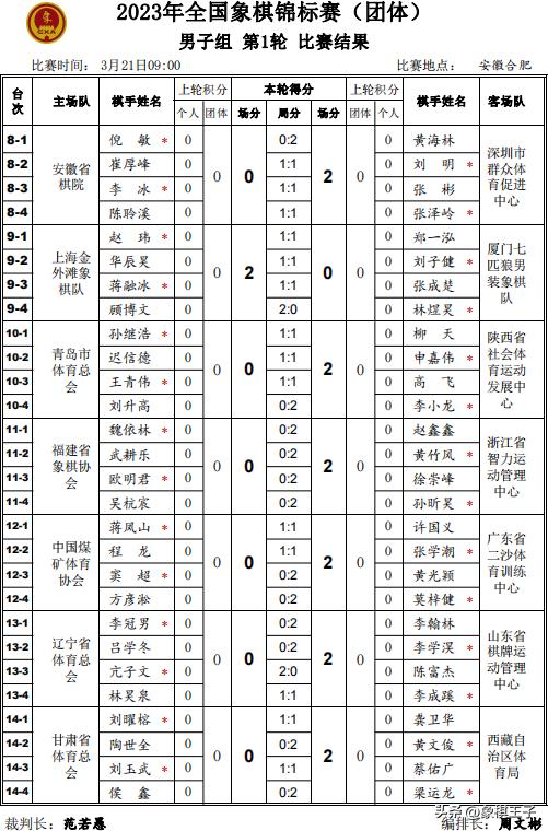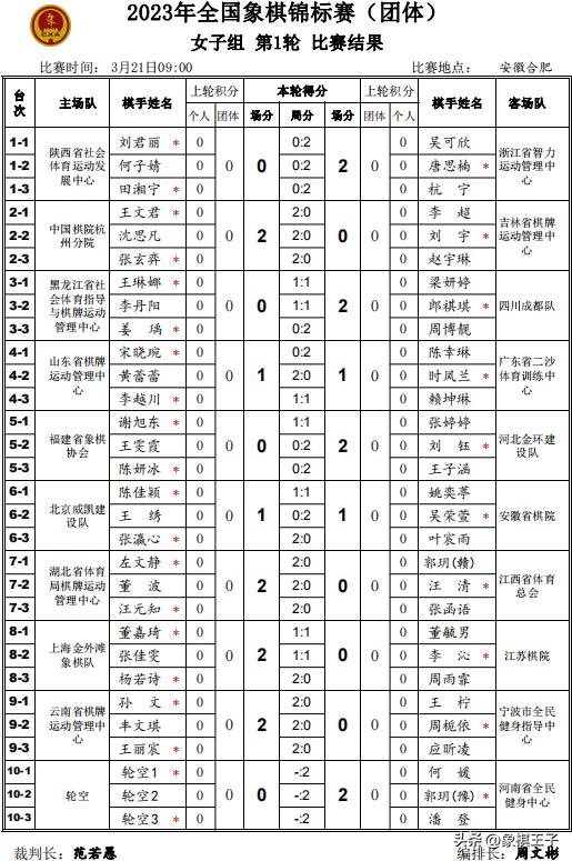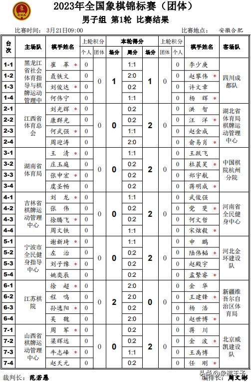 3月21日,全國象棋團體賽首輪比賽在安徽合肥戰罷,湖北隊、河北隊、浙江隊、江蘇、北京、上海等多支隊伍紛紛獲勝,四川隊戰平黑龍江。