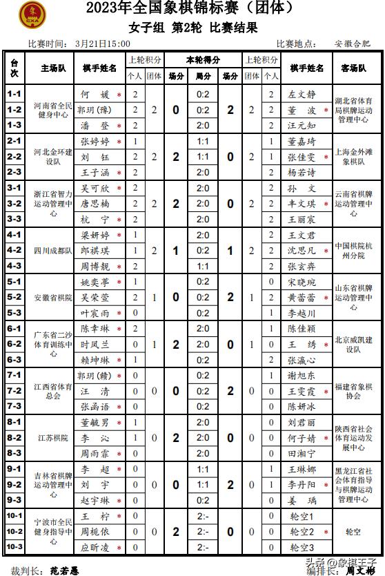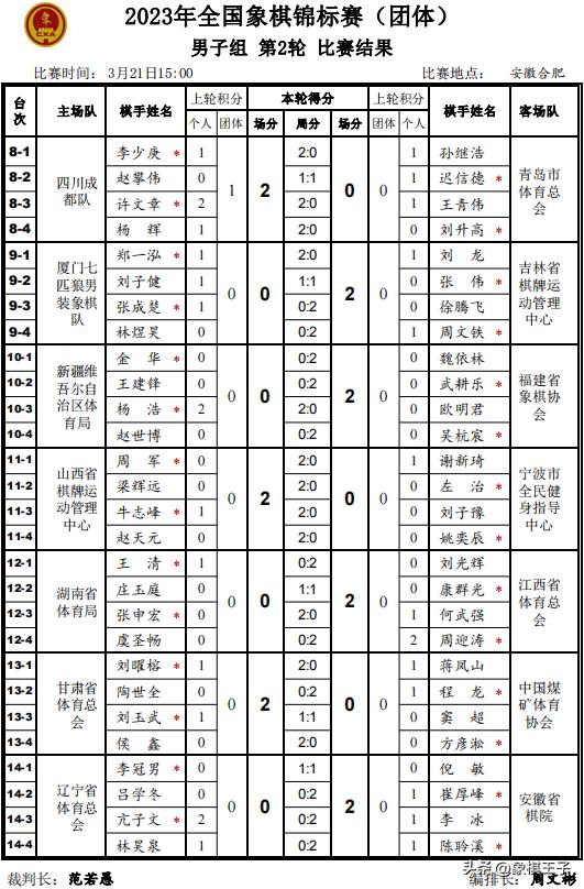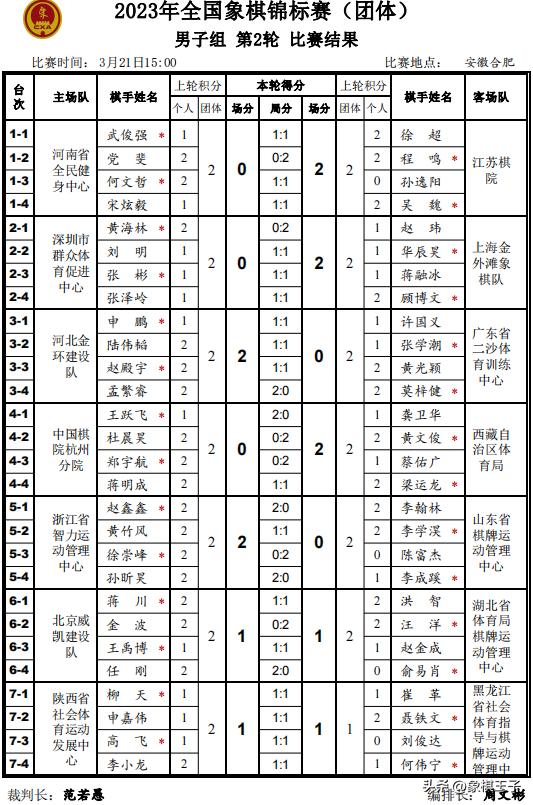 3月21日,2023年全國象棋團體賽第二輪比賽在安徽合肥戰罷,男子組河北、浙江、江蘇、上海、西藏奪得二連勝領先,女子組湖北、浙江、河北三隊兩連勝居首。