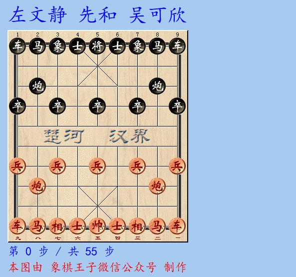 女子組兩支二連勝隊伍相撞,湖北對壘浙江,1臺左文靜與吳可欣之仗,左文靜執先佈下拿手的飛相陣,吳可欣應以挺7卒。