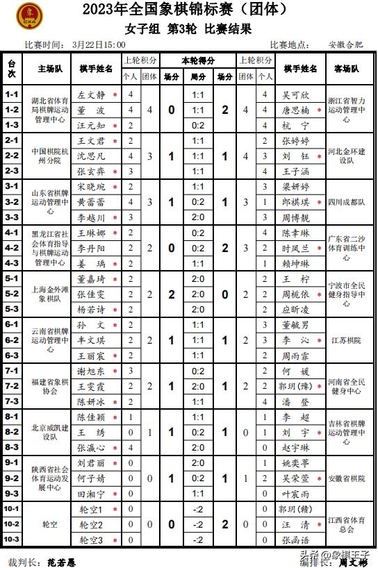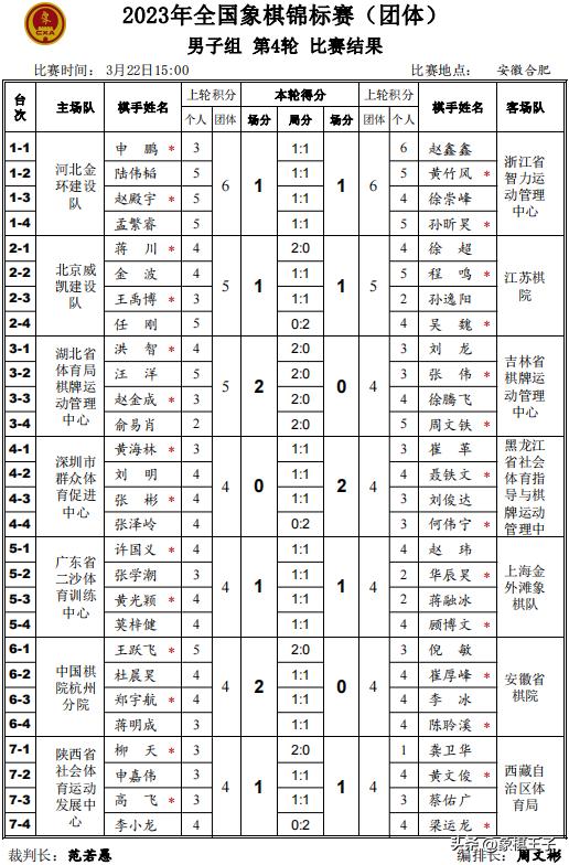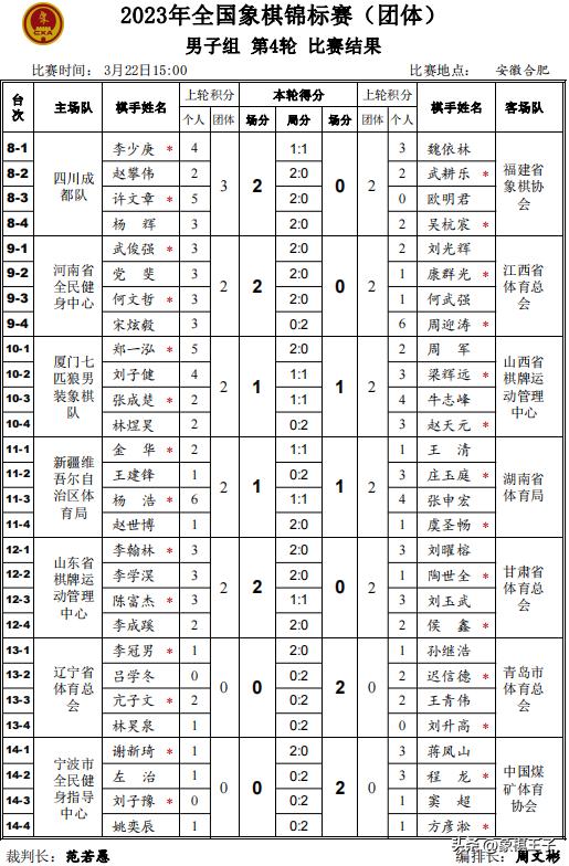 3月22日,全國象棋團體賽男子組第四輪、女子組第三輪比賽在安徽合肥戰罷,男子組浙江河北打平,兩隊各爲三勝一平積7分,湖北擊敗吉林,同樣積至7分,北京、杭州、江蘇6分,女子組浙江贏下湖北後,三戰全勝居首。