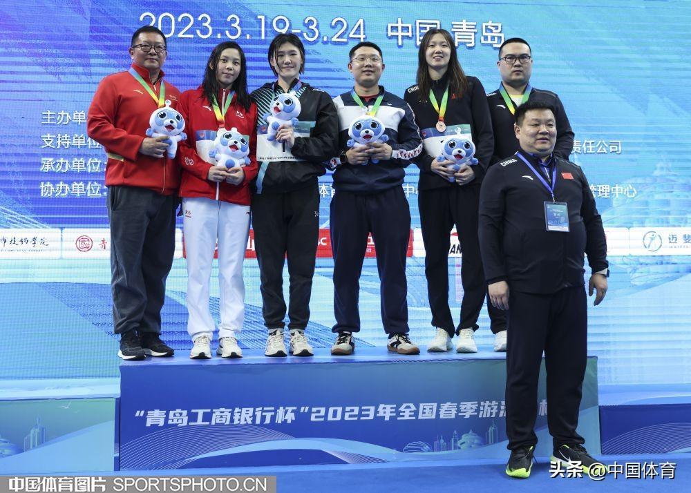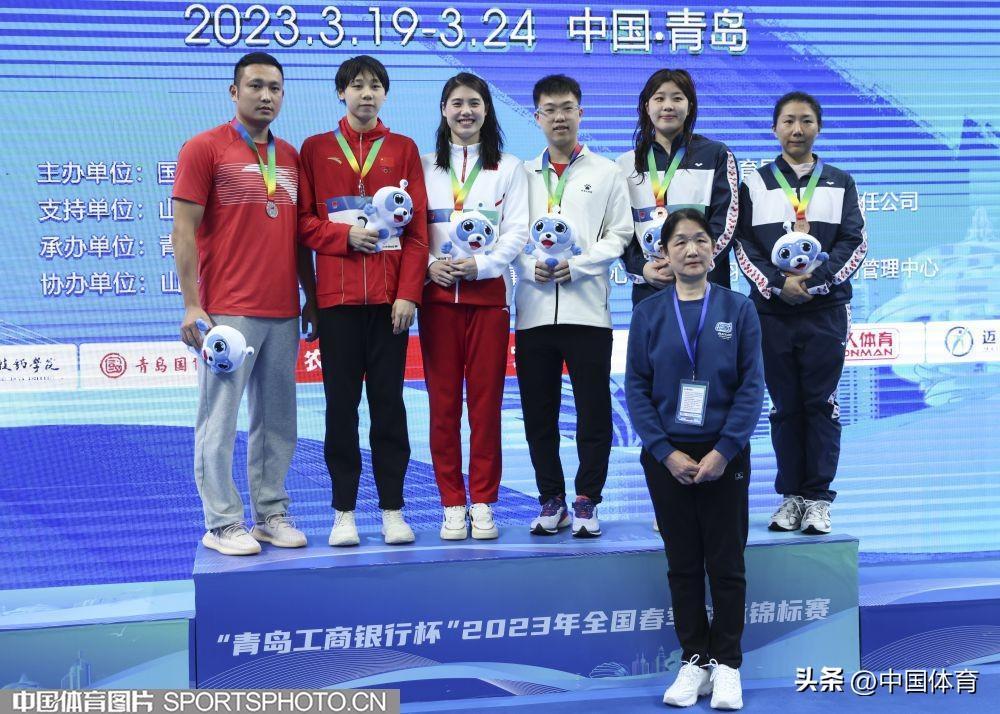 冠軍張雨霏(左三)、亞軍程玉潔(左二)和季軍吳卿風(右二)與頒獎嘉賓合影留念