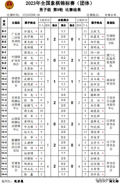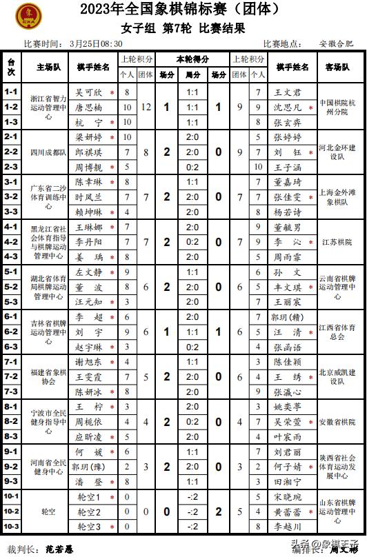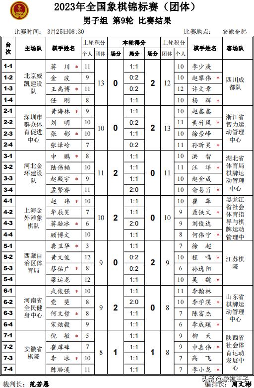 3月25日,2023年全國象棋團體賽最後一輪比賽在安徽合肥戰罷,男子團體,浙江隊擊敗深圳隊,北京隊不敵四川隊,浙江男隊以九戰15分加冕冠軍,四川亞軍,河北季軍,北京殿軍。女團浙江第一,杭州第二,四川第三。