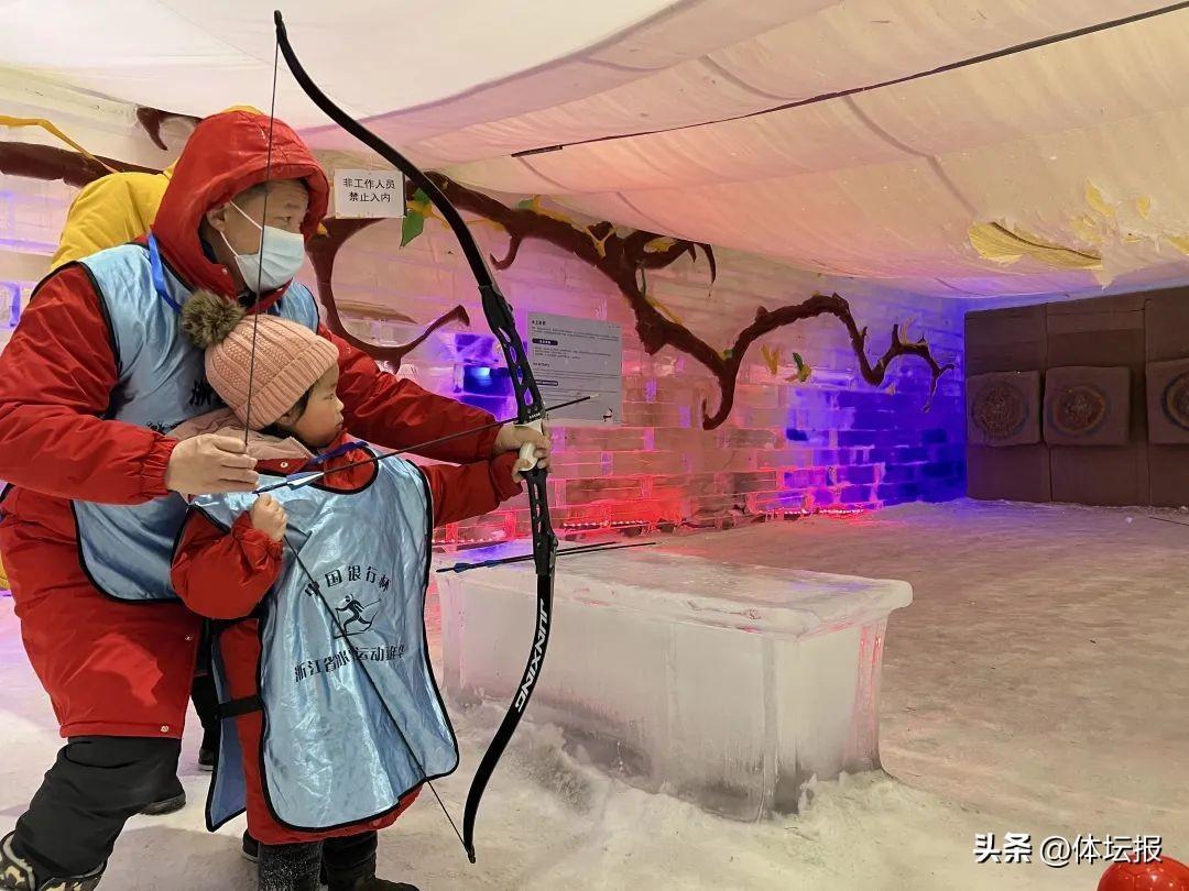 這邊,孩子與家長坐着輪胎踏冰而下,飛速滑行,尖叫連連。雪上射箭比賽傳來陣陣呼聲,選手們身端體直,從容架箭,頗有武俠英雄的氣勢;那廂,冰壺比拼項目擠滿觀衆,瞄準、推球、滑弧線,選手時而站立,時而蹲伏,冰壺球從手中滑出,穩穩停在紅藍圈裏,贏得掌聲一片。“冰壺是冬奧會正式比賽項目,我們間接當了一回奧運選手!”選手林珍悅笑着打趣道。