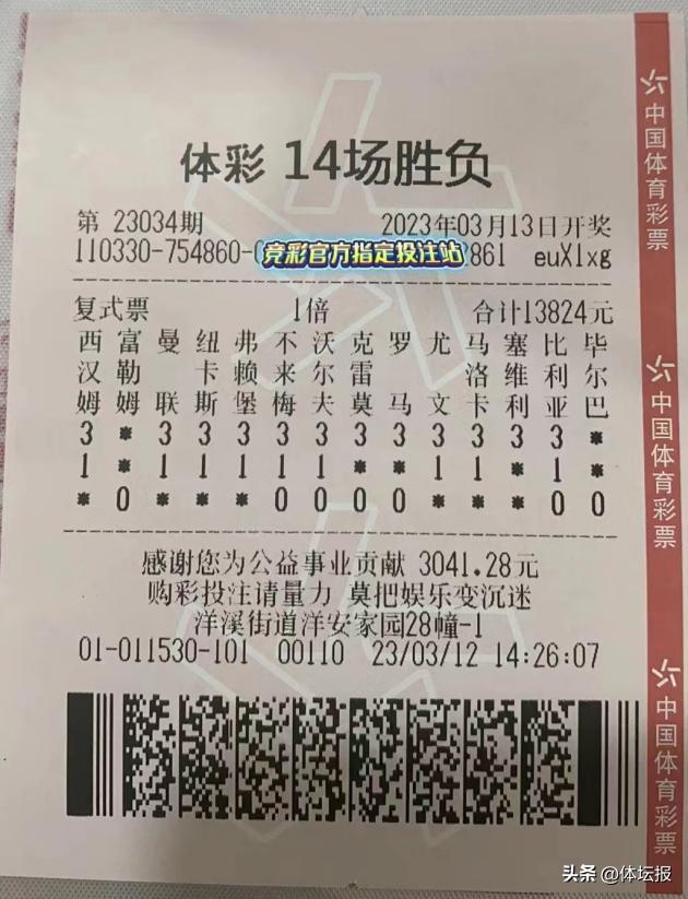 3月13日,傳統足彩14場勝負遊戲第23034期開獎,位於杭州市上城區新風麗都北苑42號的3301003274體彩實體店傳來喜訊,該店幸運購彩者李先生憑藉一張複式票中得一等獎1注、二等獎14注,共計獲得獎金632098元。