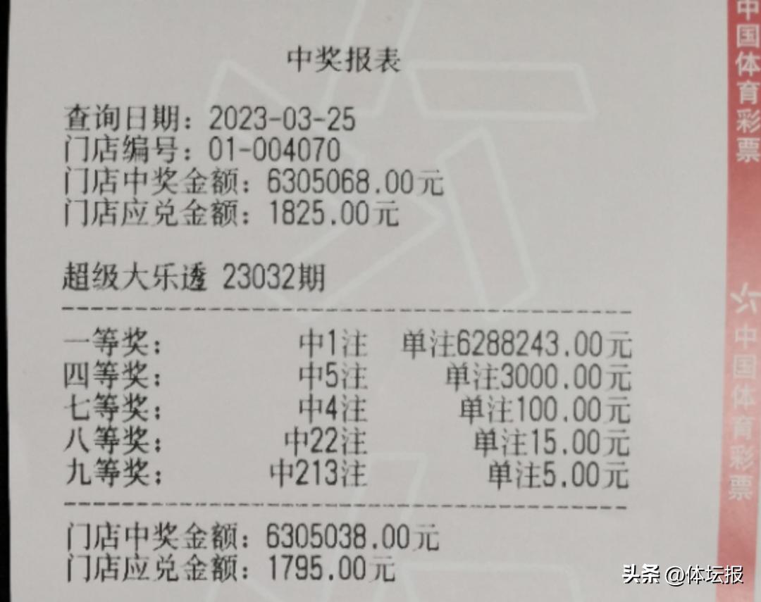 3月25日,位於杭州市拱墅區夾城巷10號的3301004070的體彩實體店傳來喜訊。該店有購彩者憑藉一張12元面值的“6+2”複式票,喜中大樂透第23032期一等獎1注,單票收穫獎金630萬元!
