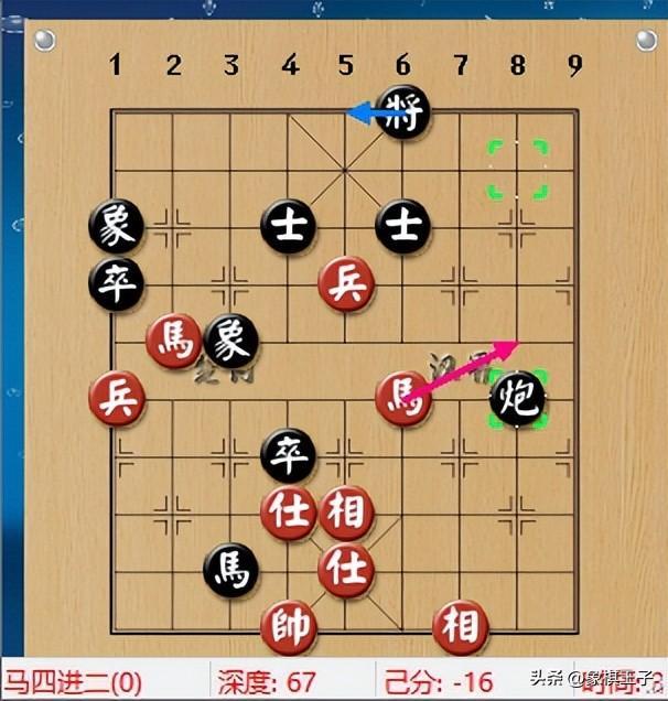 兩邊進入雙馬雙兵仕相全對馬炮雙卒士象全,黑進炮瞄兵,紅原本馬四進二跳進去,黑擺4路炮要殺,紅進馬一將,再退馬踩炮,瞬即化解。