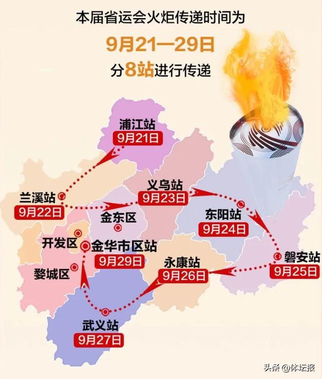 9月21日,浙江省第十七屆運動會聖火在金華浦江縣上山考古遺址公園點燃,火炬傳遞活動正式啓動。隨後省運聖火從浦江出發,依次傳遞至蘭溪、義烏、東陽、磐安、永康、武義等地,29日再回到金華市區進行最後一站傳遞。