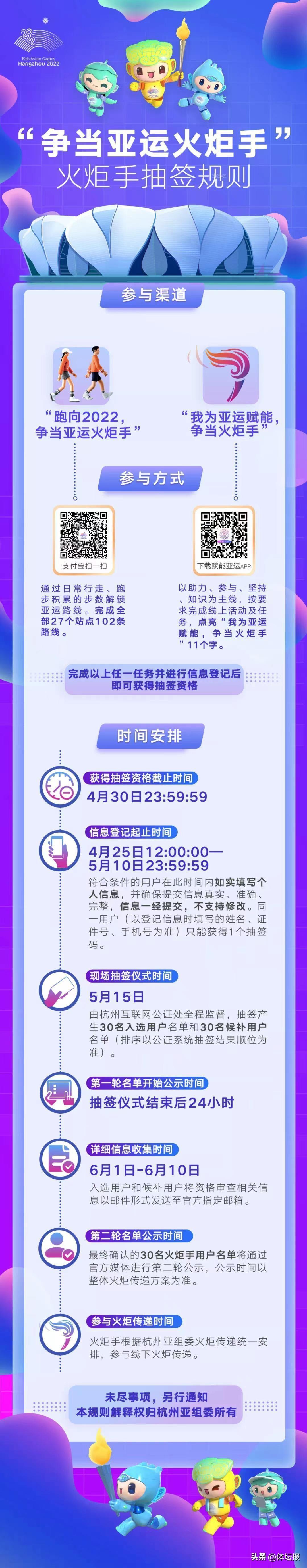 活動結束後,所有按規則完成任務的用戶需填寫相關信息進行登記,擇時還將舉行抽籤儀式,最終“爭當亞運火炬手”會產生30名杭州亞運會火炬手並參與杭州亞運會火炬傳遞。