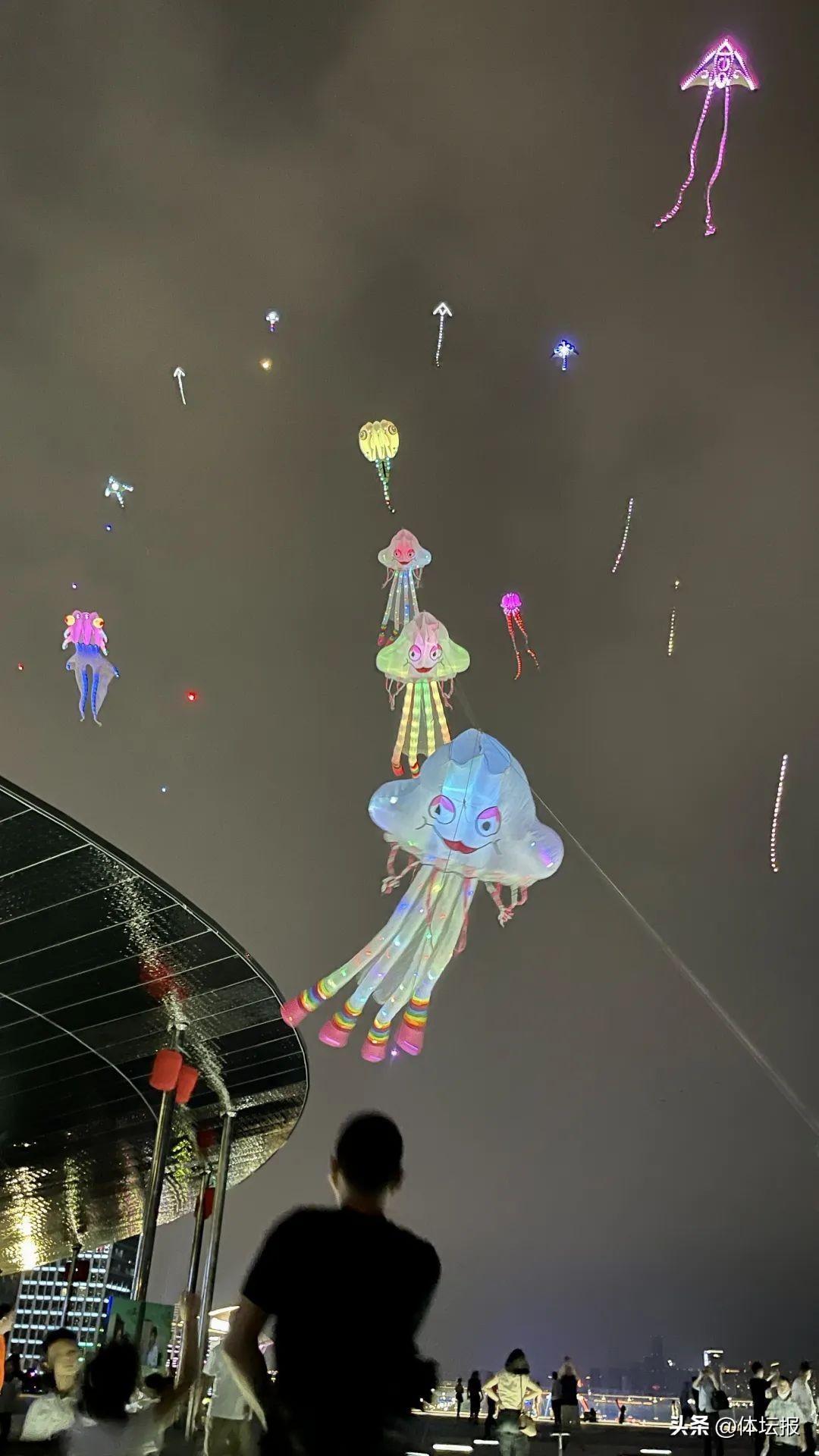 天上明月高懸,甌江光影奪目,熠熠生輝。溫州市風箏協會80多名會員,參加了夜光風箏放飛表演,空中五彩繽紛的夜光風箏和甌江山體燈光秀相互融合,打造出璀璨的不夜甌江。夜光風箏包括水母、章魚、金魚等逼真的動物造型,也有凱蒂貓、唐老鴨等可愛的卡通人物,不少市民聞訊從全市各地趕往現場觀看。