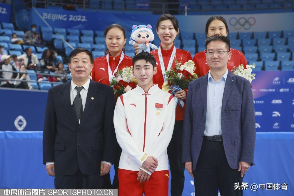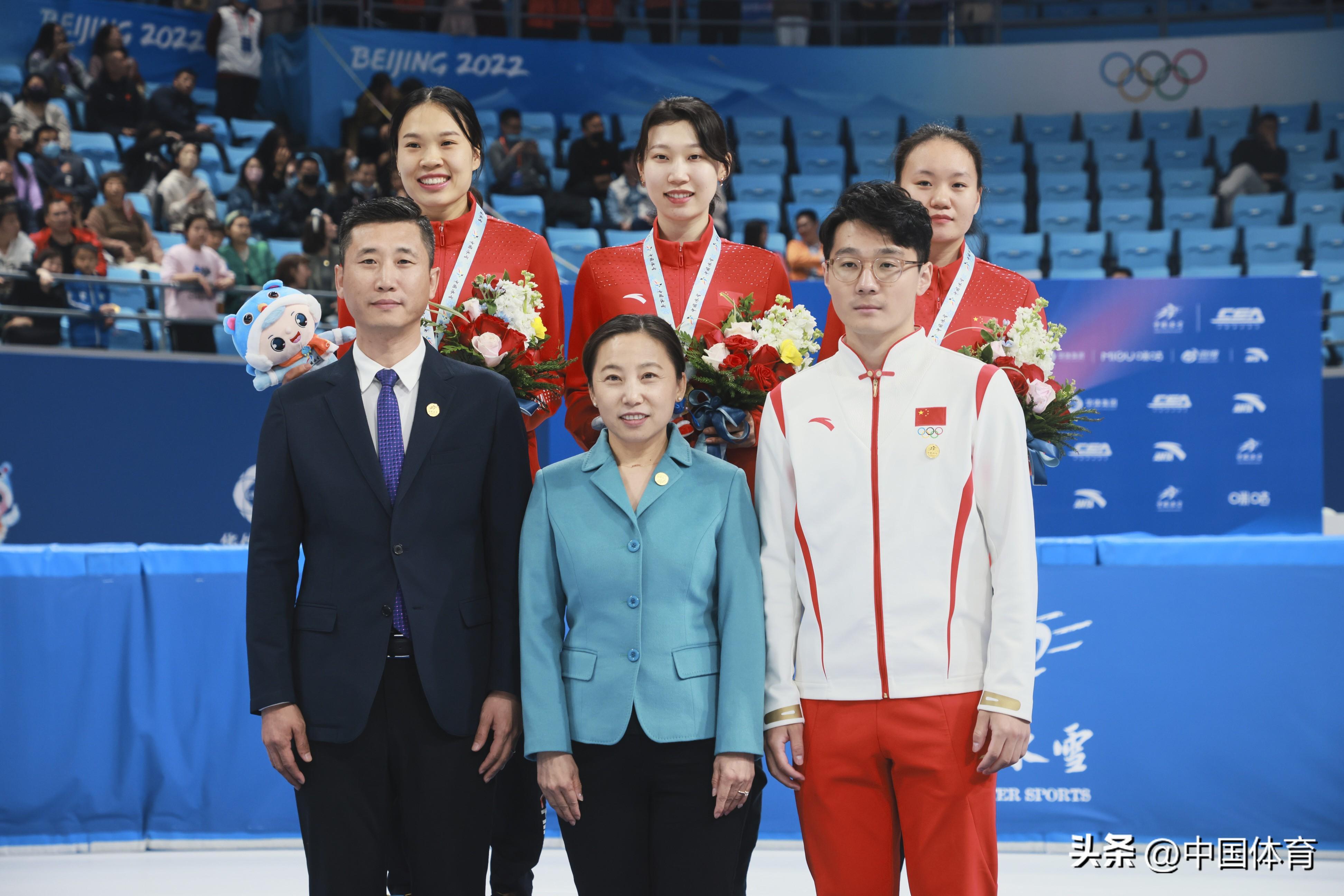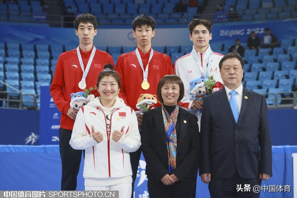 頒獎嘉賓任子威(前排右一)與女子1000米前三名合影留念