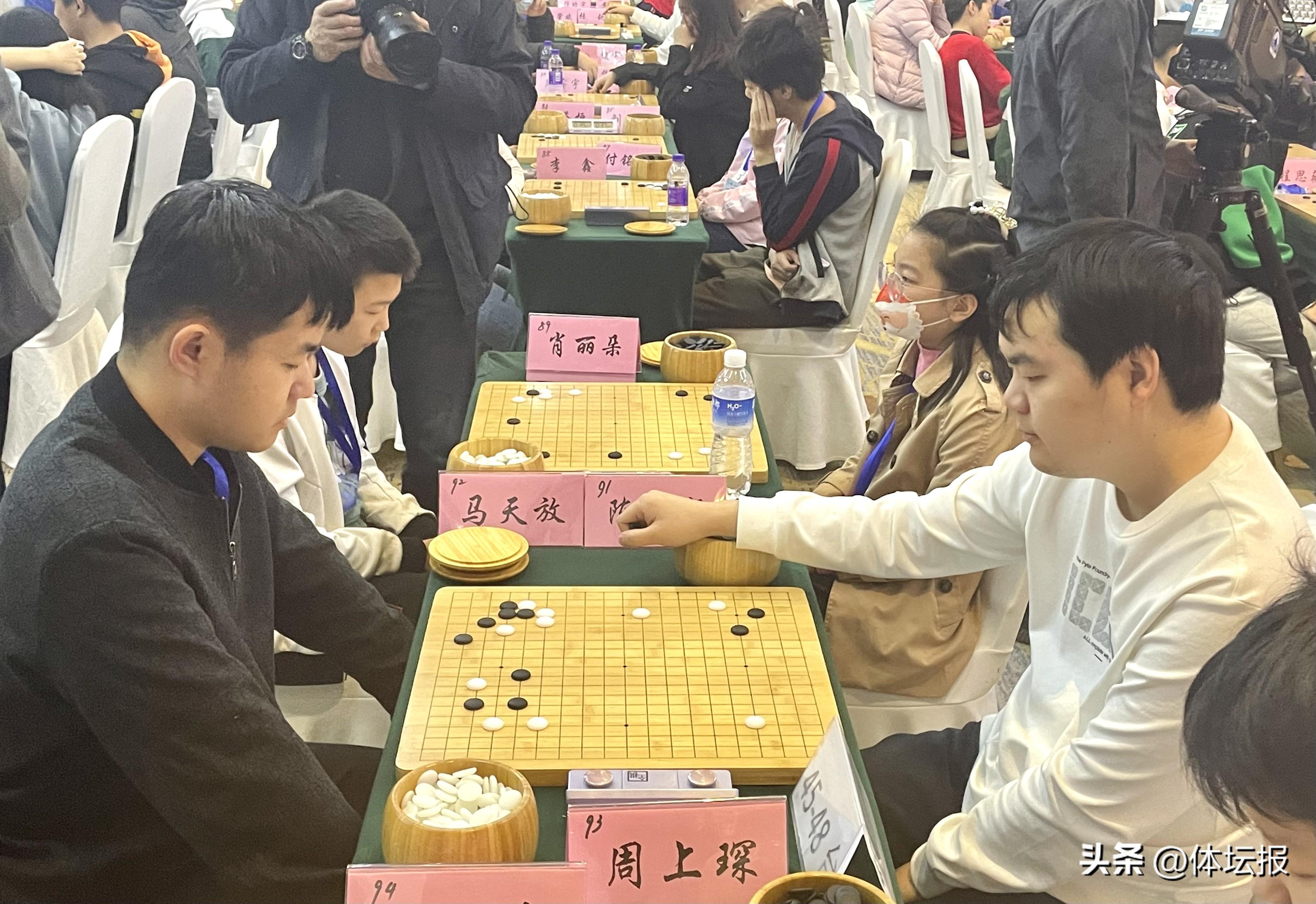45號桌臺人頭攢動,引來不少現場觀衆圍觀,原來業餘圍棋世界冠軍馬天放8段正與2023晚報杯的新科冠軍陳楊8段展開天王山之戰。只見棋局看似雲淡風輕,實則步步爲營。在盤中局部糾纏中,馬天放出現小失誤,立刻被陳楊抓住機會,導致大龍憤死,最終告負。賽後,陳楊坦言,今天能取勝還是非常幸運的,期待之後的比賽能有更好發揮。