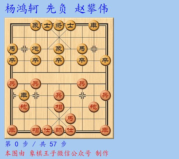 紅不單丟馬,還子力受制,沒有攻勢,黑方火力全開,車馬炮躍出,加過7卒,退炮掃蕩騎河線,紅無力迴天,楊鴻軻認敗。