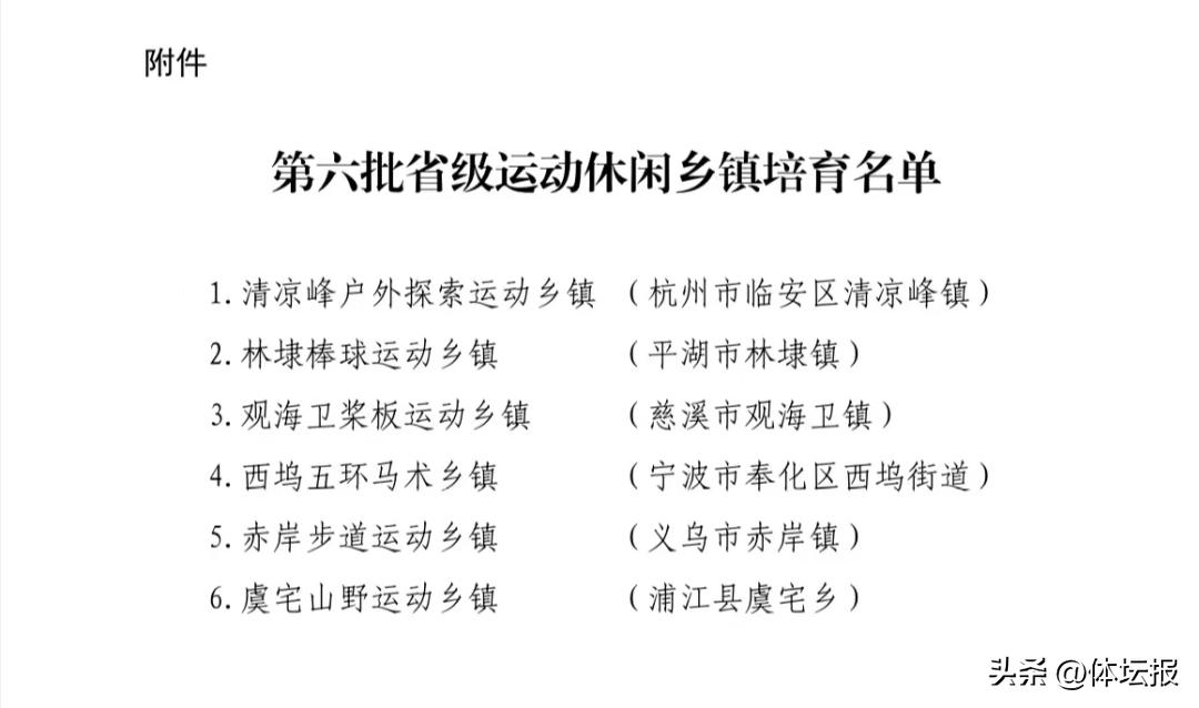 近日,浙江省體育局公佈了第六批省級運動休閒鄉鎮培育名單,全省共有6個鄉鎮入選,分別爲清涼峯戶外探索運動鄉鎮(杭州市臨安區清涼峯鎮),林埭棒球運動鄉鎮(平湖市林埭鎮),觀海衛槳板運動鄉鎮(慈溪市觀海衛鎮),西塢五環馬術鄉鎮(寧波市奉化區西塢街道),赤岸步道運動鄉鎮(義烏市赤岸鎮)以及虞宅山野運動鄉鎮(浦江縣虞宅鄉)。