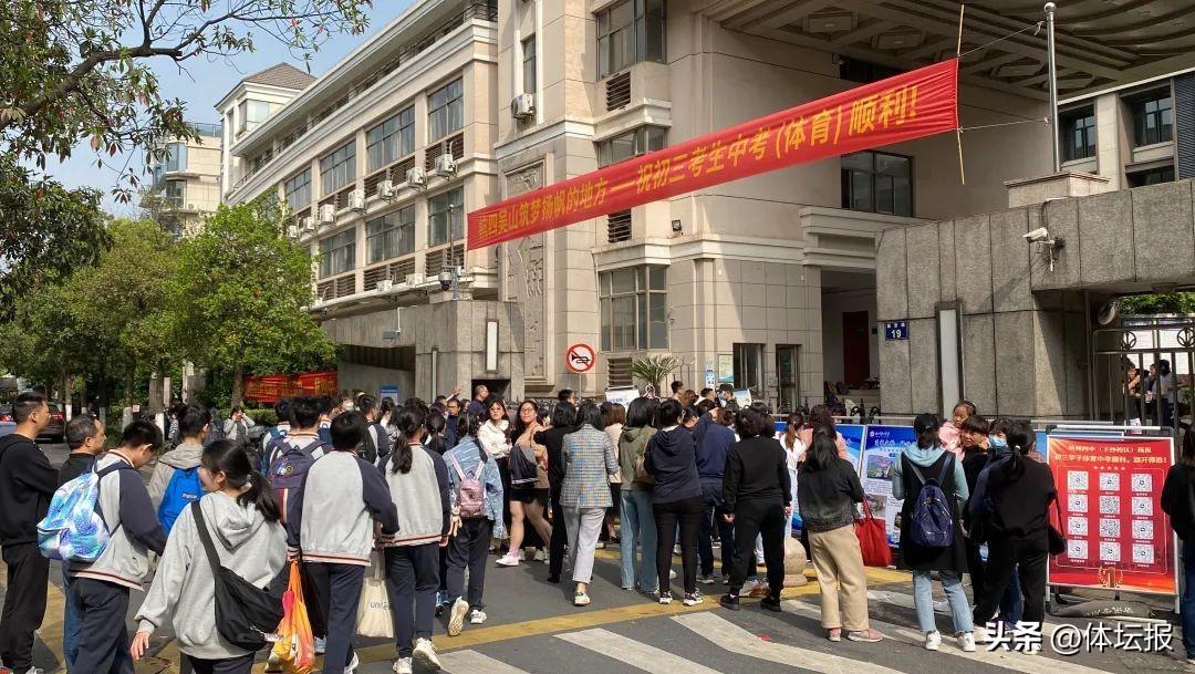 8點左右,中考隊伍浩浩蕩蕩地走進校園熱身,與孩子們形成鮮明對比的是場外成堆站立的家長。