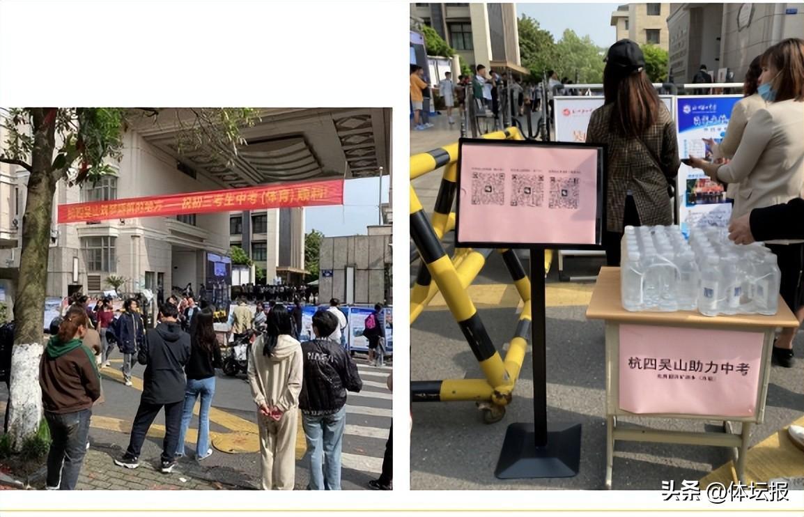 早上,記者來到考點之一的杭州第四中學吳山校區,校門口拉起的橫幅上寫道:“杭四吳山築夢揚帆的地方——祝初三考生中考(體育)順利!”校門口還擺放着助力中考的攤位,考生可以自取免費礦泉水。